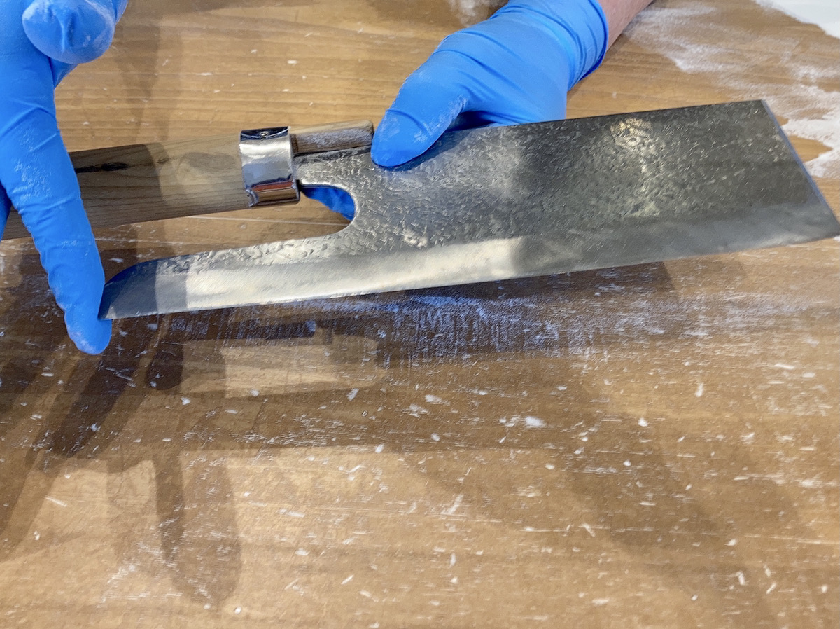 昔話に出てきそうな大きな包丁にどきどきしながら麺切り。