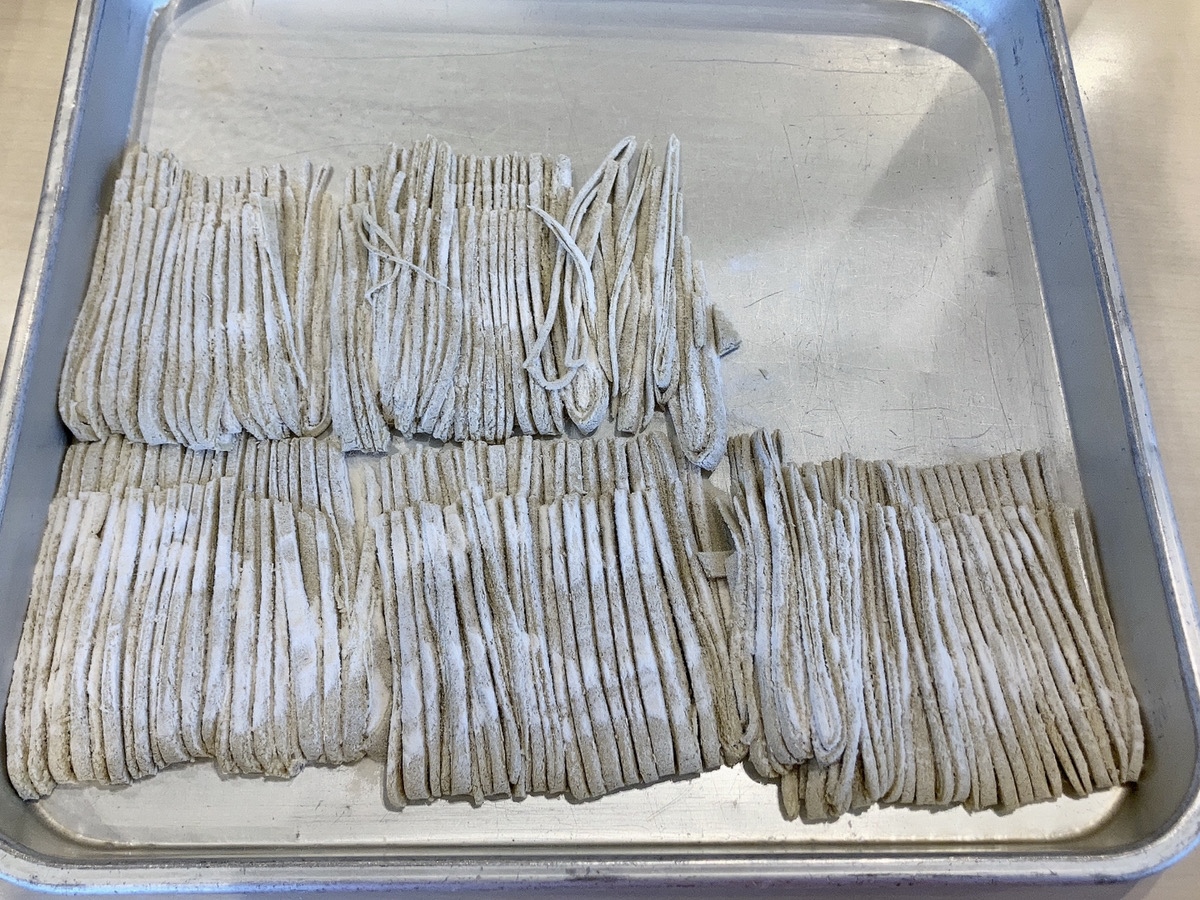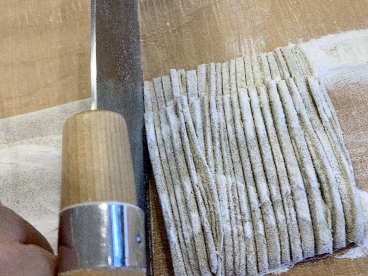 薄くなった蕎麦を折りたたみ、切っていきます。