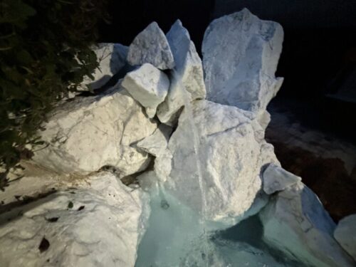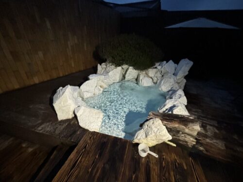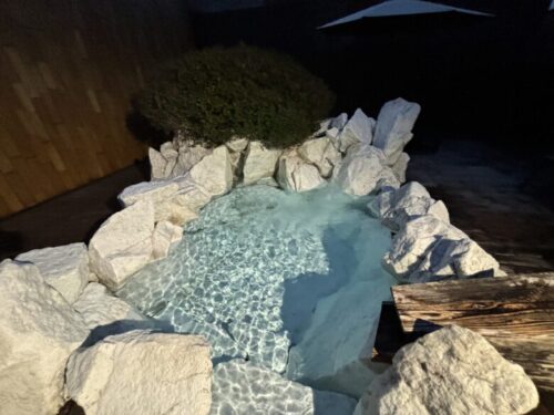 元は熊本地震の際に御船町の農道を塞いでしまった巨石で、その石をオークションで落札しダイナマイトで爆破させて水風呂に利用したとのこと。