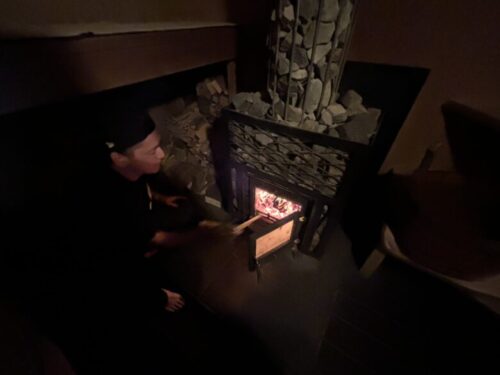 (↑実際に入る前に説明がてら薪を入れて下っている奥井さん)