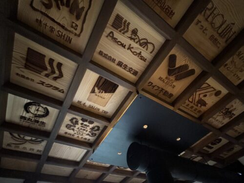 クラウドファンディングによって作成されたこのサウナ。天井には支援いただいた企業様などのロゴが載っています。