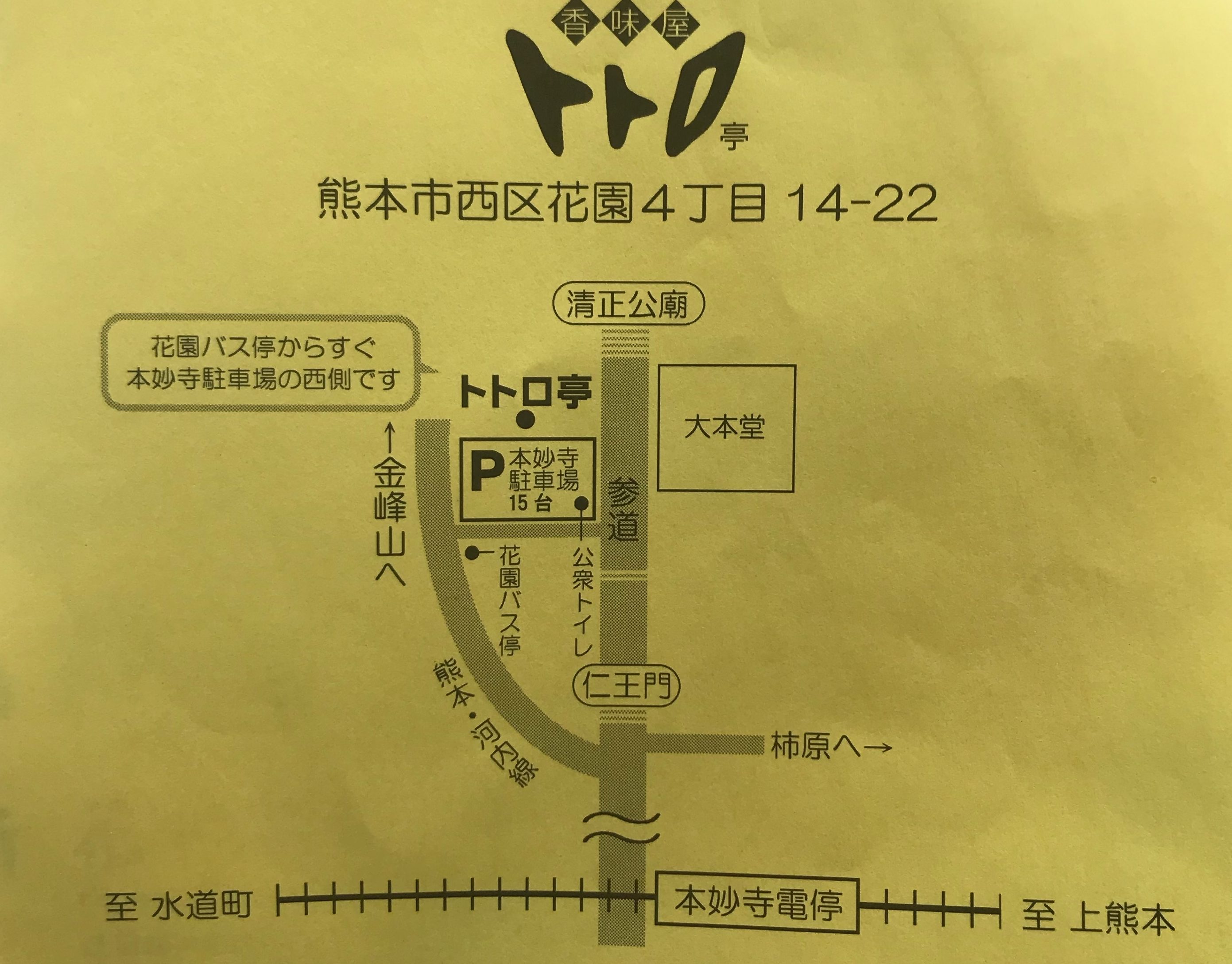 場所は本妙寺通りから、県道1号線(熊本・河内線)に入り花園バス停から右折