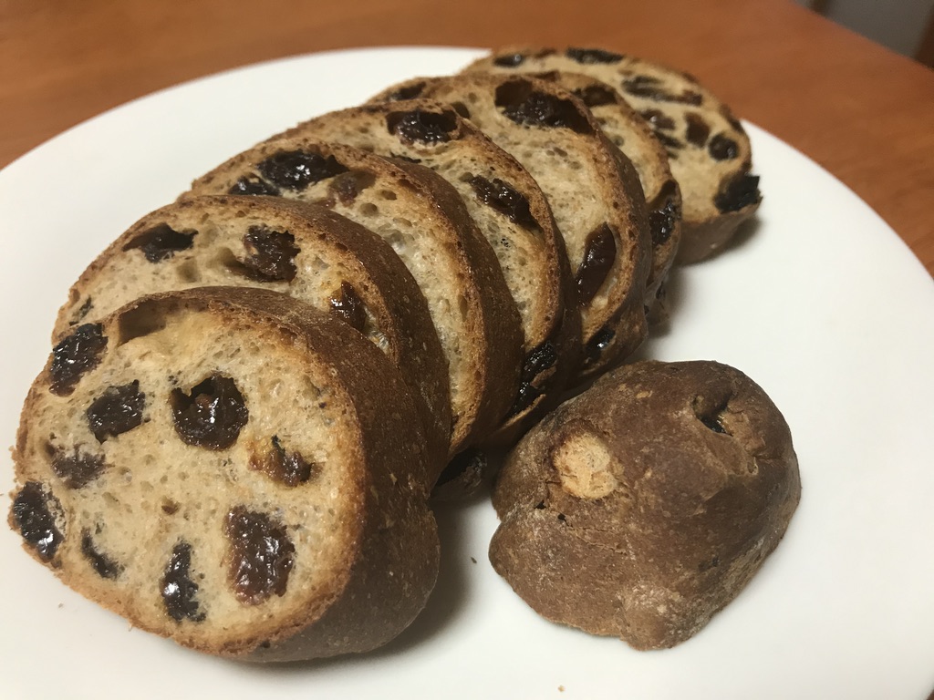 食べると、まずレーズンの甘酸っぱさがフワァと口の中に広がり、その後を麦の香ばしさが追いかけてきます。