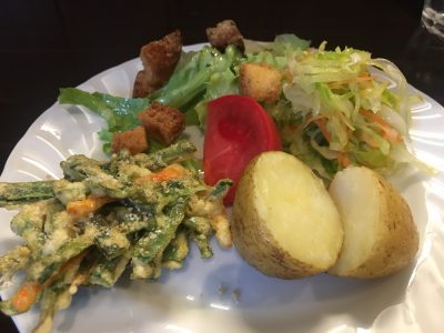 ニラは奥様が自ら収穫されたばかりのもので、レタスも無農薬のものとのこと。レタスは味が濃く、じゃがいもはほくほく!かき揚げはサクサクした軽い感じで、どれもおいしい!安心して新鮮な野菜を食べられる幸せを噛みしめながらいただきました。