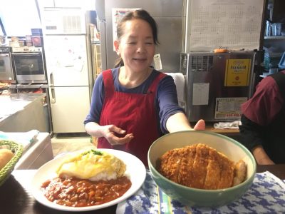 その他、オムハヤシとカツ丼はこんな感じ。ボリュームがすごい!カツ丼はカツを卵でとじておらず、後のせしてあるので、サクサクのカツが味わえます。