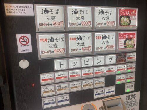 マヨネーズやチーズ、ねぎゴマや半熟卵など(50円〜)のトッピングもここで注文しますが、無料トッピングのすりおろしニンニク、つぶし生ニンニク、つぶし生ニンニクW(ダブル)、柚子こしょうも食券が必要です。