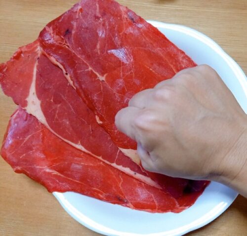拳3つ分ほどの薄切り肉が3枚も。