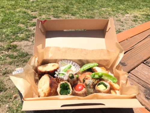 プラスチック容器ではなく、紙の箱に入っているのも環境に優しくて素敵です。見た目もかわいくて、まるでピクニックボックス!野菜巻きは、野菜嫌いの子どもたちでも食べられると好評なので、子どもを公園で遊ばせたりする時のランチにも良さそうです。