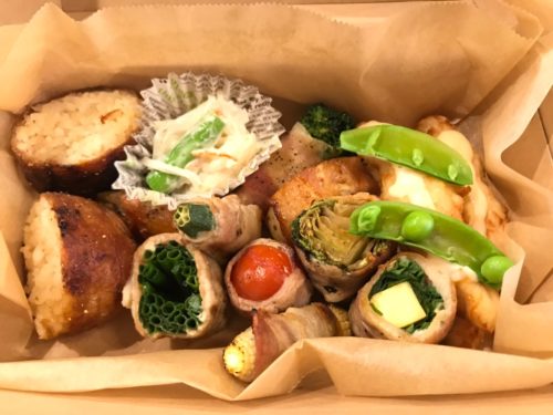 ミニトマトやブロッコリー、青ネギやレタスにみょうがなどの野菜巻きがぎっしり!さらに、肉巻きおにぎりや、副菜(この日は、アスパラとカニカマと春雨のサラダ)、ささみの唐揚げまで入って、ヘルシーでありながら、ボリューム満点!豚肉には疲労回復効果もあるそうで、栄養もバッチリです。