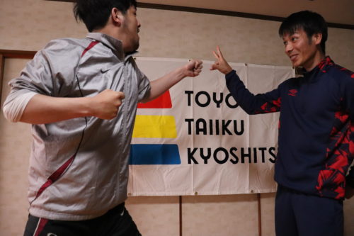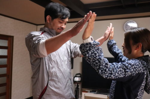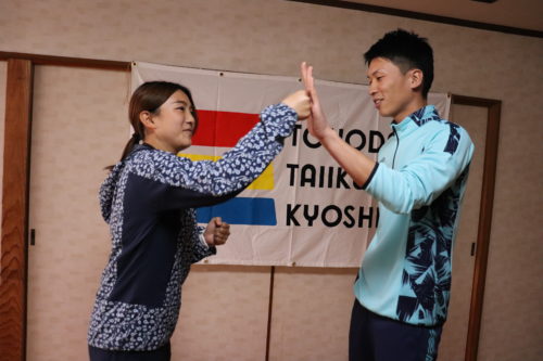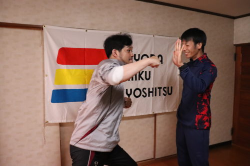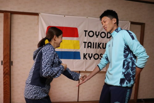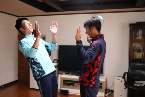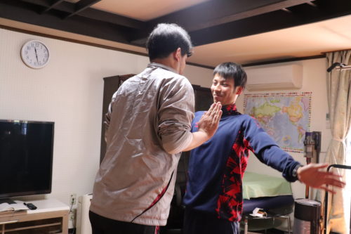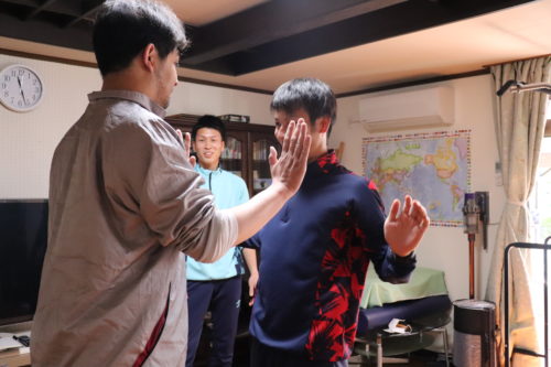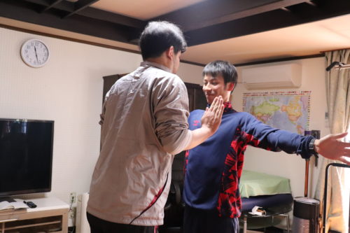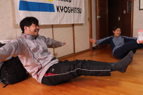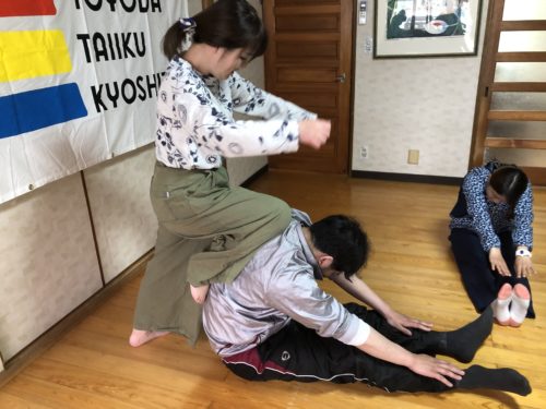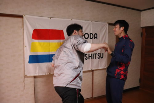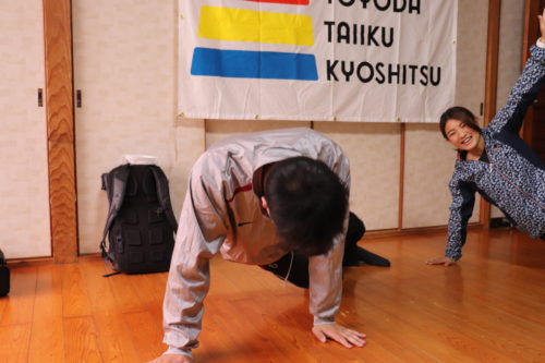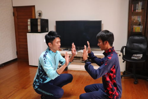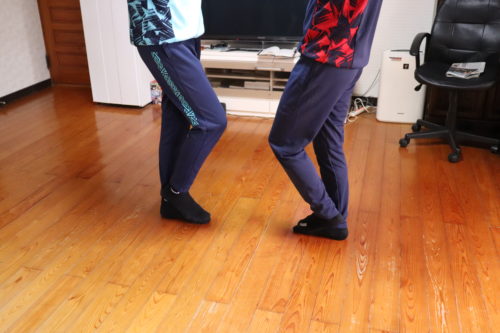 あとは、いつもの要領で手押し相撲開始!片足立ちなので、バランス保持が難しく、体幹も鍛えられそう。