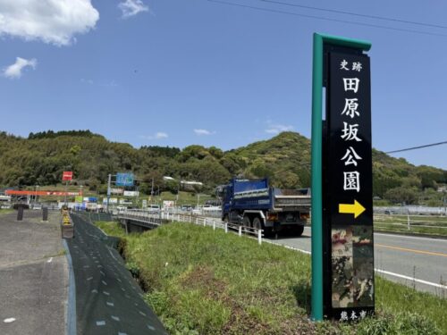 田原坂公園の入口のすぐそばのガソリンスタンドの手前になります。こちらは信号待ちで車が並ぶので、少し分かりづらいです。