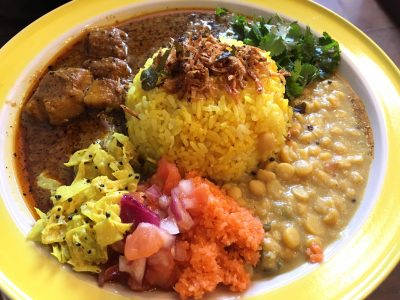 実際に食べてみると、左側のお肉の入ったカレーはスパイシーで深みのある味、右側のカレーは3種類の豆が入ったコクのあるまろやかな味で、もう本当に絶品!ライスの上にトッピングされた干しエビや、パクチーのアクセントも効いています。