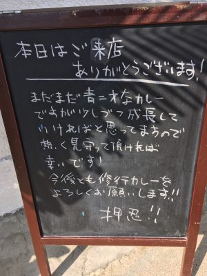 入口の看板には、謙虚なメッセージが…。カレーを追究し続ける修行カレーの神髄を感じさせてくれます。