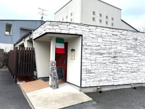 白い外壁にイタリアの国旗が目を引くシンプルな店構えのお店です。
