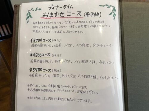 夜のコースも予約制で、3,700円~5,700円まで、内容や予算に合わせて選ぶことができます。