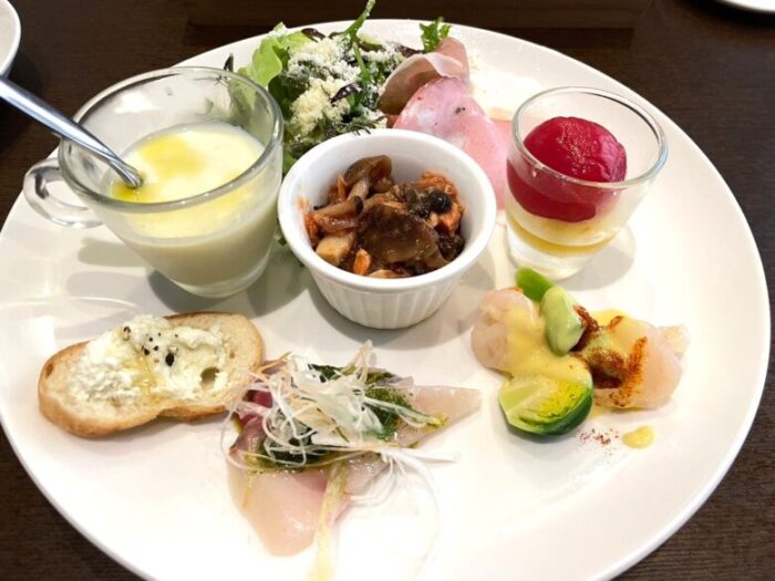 五島列島のヒラマサのカルパッチョや、エビとアスパラのアイオリソースにさつまいもの冷製スープなど、一つ一つ丁寧に作られた前菜が華やかに盛られています。