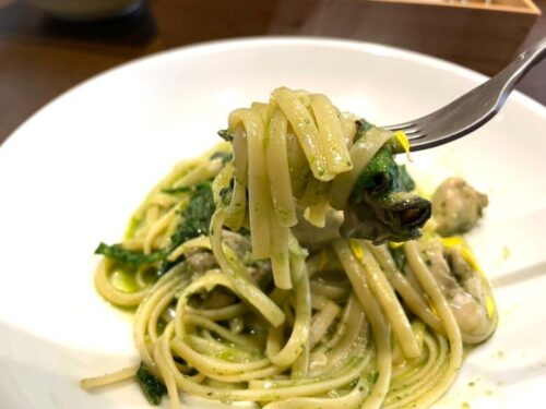 鮮やかな春菊のソースに、ぷりっぷりのカキが贅沢に使われているパスタ。