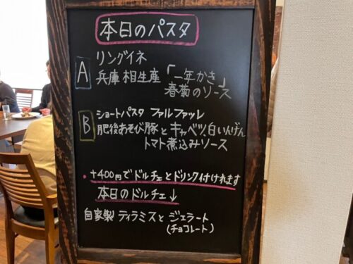この日のパスタはこちら。兵庫相生産「一年かき」春菊のソースのリングイネを頼んでみました。