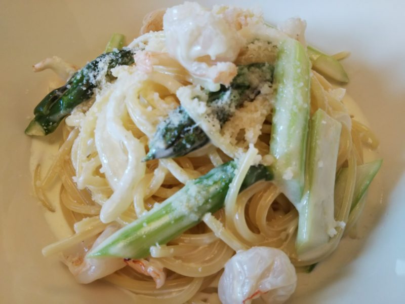 しゃきしゃきの歯ごたえがある大きめのアスパラと、ぷりっぷりのエビが入っています。クリームソースもたっぷりで、パスタとの相性も抜群でした。