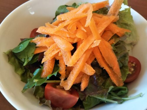少し厚めに切っている人参をはじめ、多くの新鮮な野菜を摂ることができます。自家製ドレッシングは絶品でした。数種類の野菜と果物をまぜた醤油ベースのオリジナルドレッシングです。