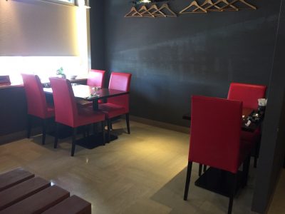2人や4人がけテーブルがあり黒に赤が効いた大人を感じさせる店内です。