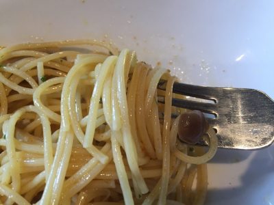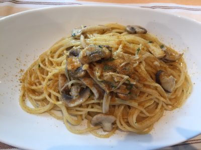 パスタはオイル系のパスタを選びました「イタリア産からすみとキノコのオイルソースパスタ」の「ボッタルガ」です。今回頼んだ量は大盛になります。