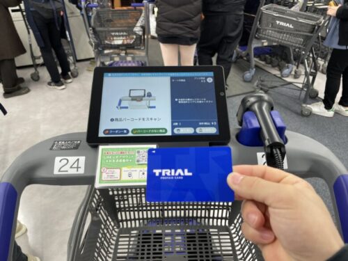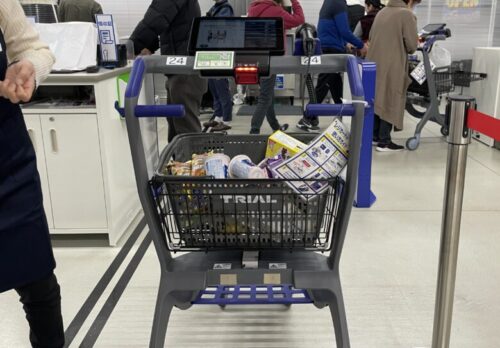 仕組みは意外と簡単で商品を入れる際に自分で商品コードをスキャンしてカゴに入れれば、今現在何を買っていてお会計がいくらというのも表示されます。セルフレジ付きのカートといった感じです!さらに現在の合計金額も表示されているので、無駄遣いの防止になって時間にも家計にも優しいです。