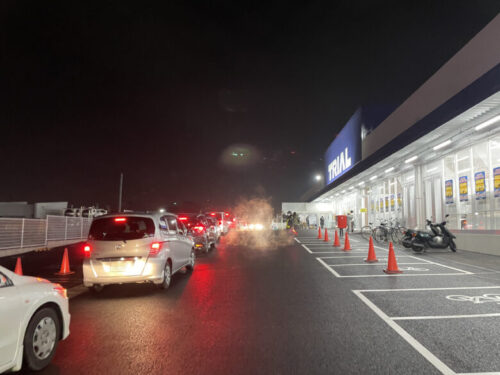 生鮮食品のみならず、衣料品や家電日用品まで揃うなんでもあるお店で、熊本市内ではトライアルクイック清水店、メガセンタートライアル上熊本店に続く、3店舗目となります。昼間は多くの人で大混雑していると思い、オープン初日の夜に実際に行ってきました。