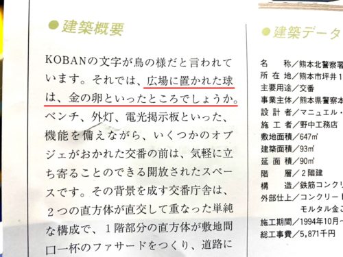 その鳥のそばにある、広場に置かれた球は「金の卵」でしょうか。と資料には記載されています。