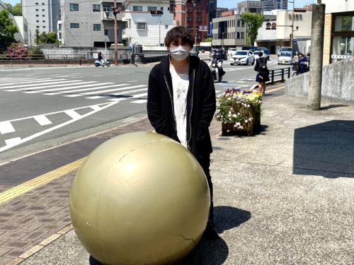 すみませーん!肥後ジャーナルと申します!目の前にあるあの「金の球体」って何なんですか?何か表現されているんですか?いつからあるんですか?