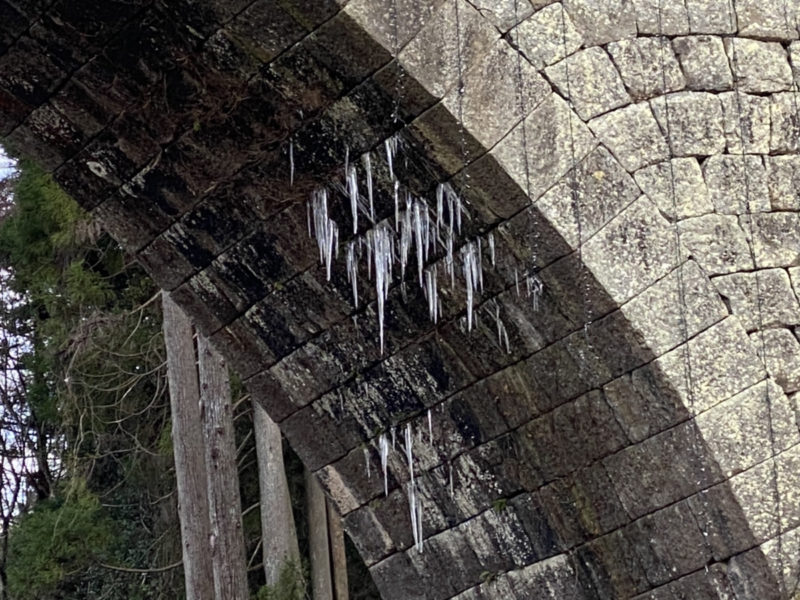 現在、山都町は夜から早朝にかけて氷点下の日が続いていることもあり、通潤橋にはつららができていました。