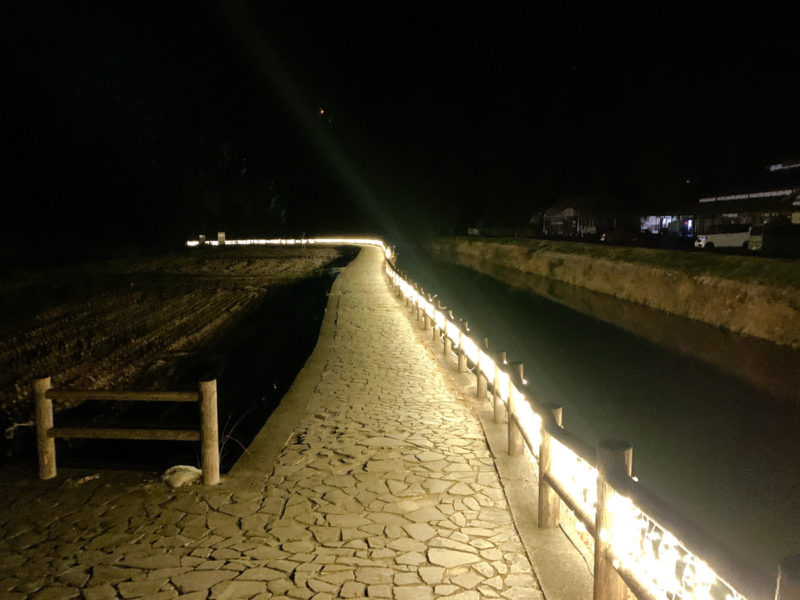 この先、柵がなくなると真っ暗なうえ、うっかり踏み外すと川に落ちてしまうので、お気をつけください!