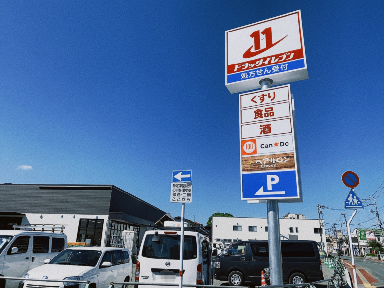 現在工事中でした。看板はもう完成していて、「ドラッグイレブン」と書かれた赤い文字がかなり目立っています。