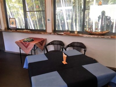 逆側も窓が大きくとられ、青々と茂る竹林が心を和ませてくれます。天井が高く、光が差し込む明るい店内です。