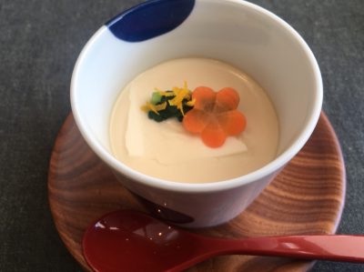 一品目は、豆腐と豆乳の茶わん蒸し。食べてみると、とろっとやわらかく、優しい味。心がほぐれます。