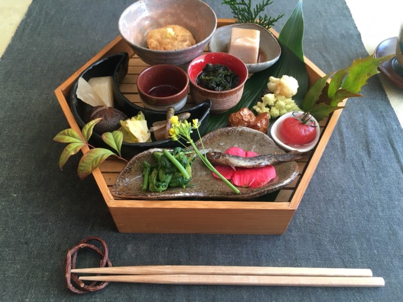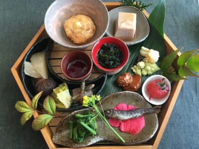 小さなおかずが一品一品、かわいらしく盛られていて、まるで宝石箱のようです。ヤマメの稚魚や、くるみ豆腐、ミニトマトの酢漬け、アロエの梅紫蘇和えなど、たくさんのお料理が盛りだくさん!つくしや菜の花もあって、旬の食材も豊富です。