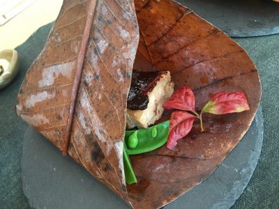 若鶏のフキ味噌焼きが大きな朴葉に包まれ、こちらも上品な逸品でした。