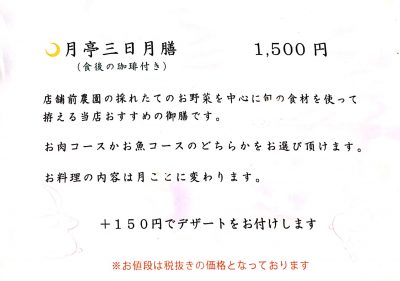 お昼のメニューは「月亭三日月膳」のみで、メインはお肉とお魚から選べます。