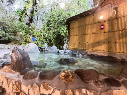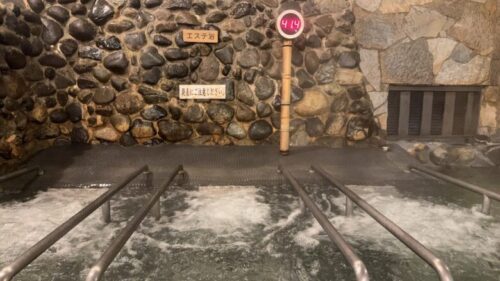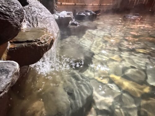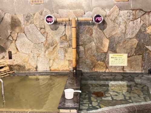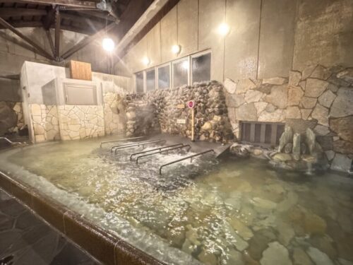 正面入り口を入って右側の扉の向こうに温泉があります。