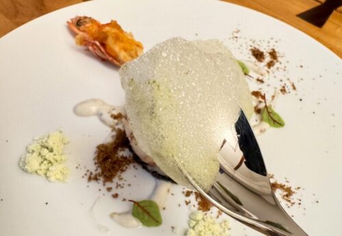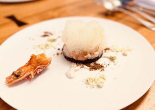 「イカ墨で炊いたプルグル(パスタを小さく切ったもの)に乗せた玄米茶の泡とアシアカエビ」