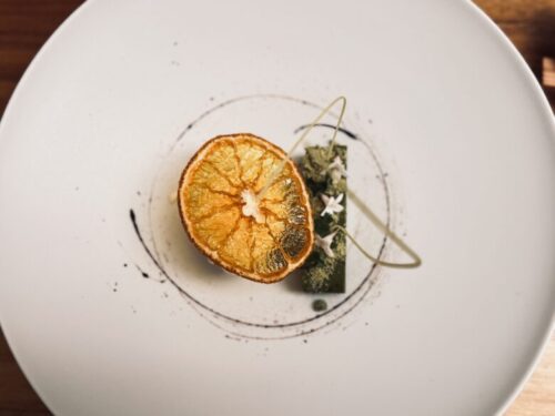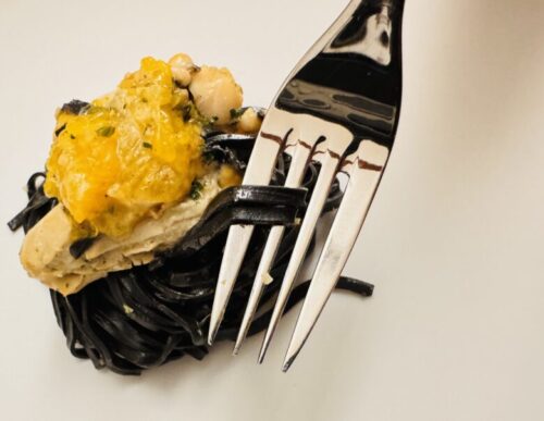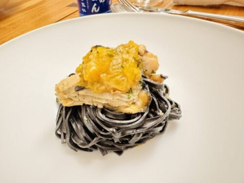 イカ墨を練り込んだ麺に牡蠣を乗せ、津奈木のみかんをトッピングしてゆずごしょうでアクセントを決め込んだパスタ。