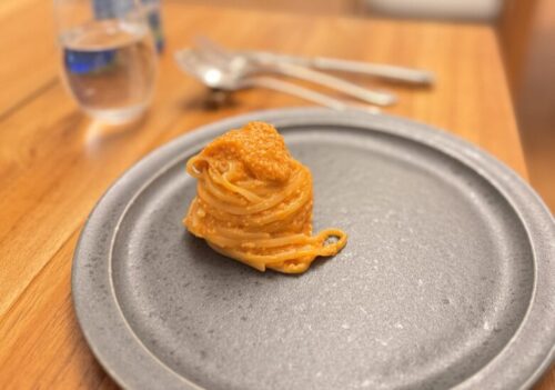 続いてもパスタ。亀萬酒造の酒粕を使ったパスタ。酒粕はまるでチーズのような味わい、イタリアンと合うんです!
