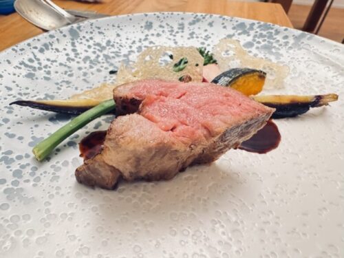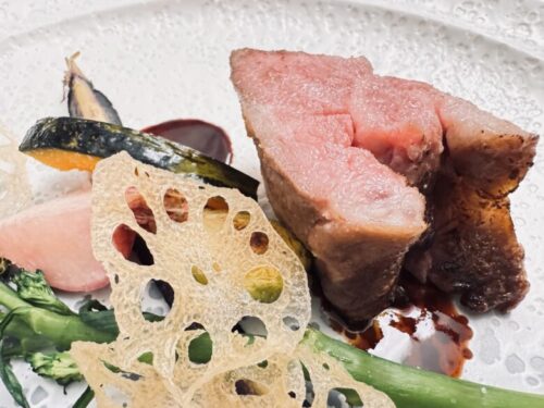 津奈木でとれた野菜と豚肩ローストにワインとほうじ茶のソース。