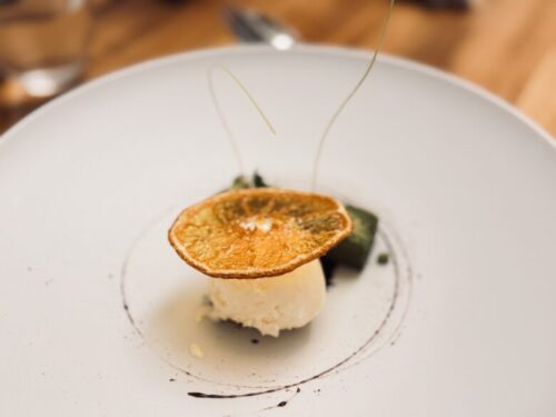 あらびき茶のテリーヌ&ドライデコポン&みかんのジェラート&アスパラを練り込んだパスタを2本刺したデザートです。