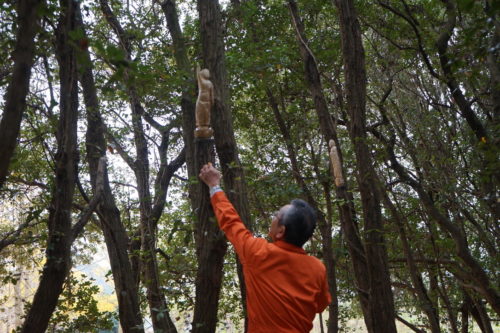 達仏とは、立木に仏教では聖数とされる33 体の仏像を彫り、地域や⼈々の活⼒ある未来を祈る場として制作されたもの。だから樹木が成長すると、仏像も形を変化させる不思議な作品なんです。