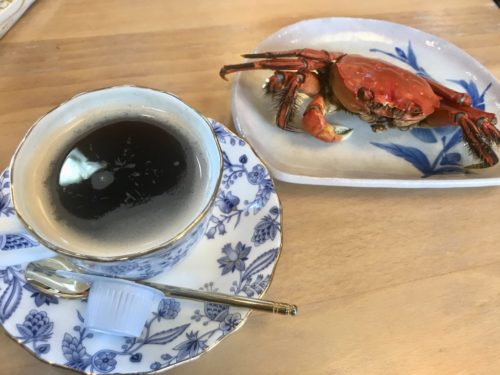 完全に余談ですが、つなぎ美術館で石田さんにごちそうになったコーヒー。お茶請けがまさかのカニでした。