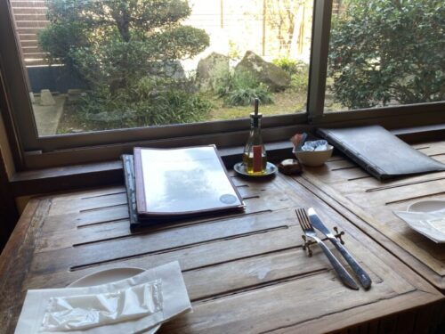 お庭が見られる席へ案内していただきました。野鳥も飛んでいて綺麗な景色です。