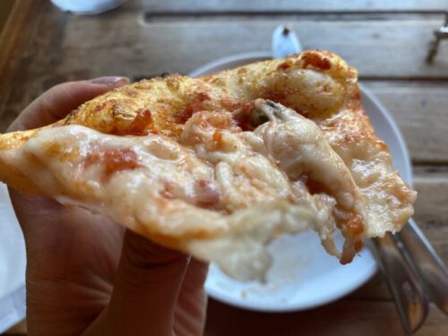 パリパリとももちもちの両方の触感を残した絶妙な焼き具合のピザ生地と、たっぷり乗った具材が合う…!