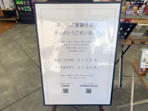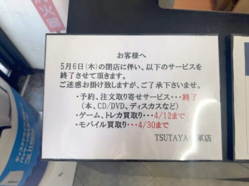 TSUTAYA AVクラブ 健軍店が5月2日(火曜日)を持って閉店との事です。