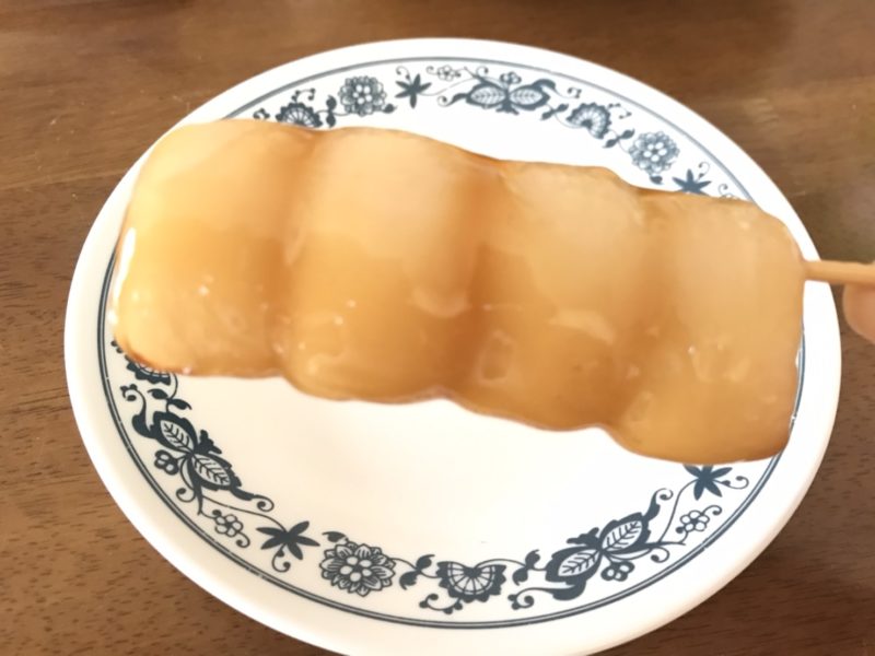 醤油だれが絡んだお団子は、ぷるんとした食感です。市販品にありがちな、ねっとりべっとりした感じはなく、歯触りがよくて、やわらか~い!